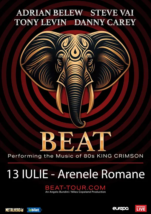 BEAT, adica trupa care ii are pe Adrian Belew si Tony Levin din King Crimson, Danny Carey tobosarul Tool si celebrul chitarist Steve Vai, canta la Arenele Romane pe 13 iulie. Trupa vine si prezinta fanilor hiturile KING CRIMSON de pe albumele Discipline, Beat si Three Of A Perfect Pair, alaturi de multe surprize. La minim 4 bilete cumparate ai discount 10%