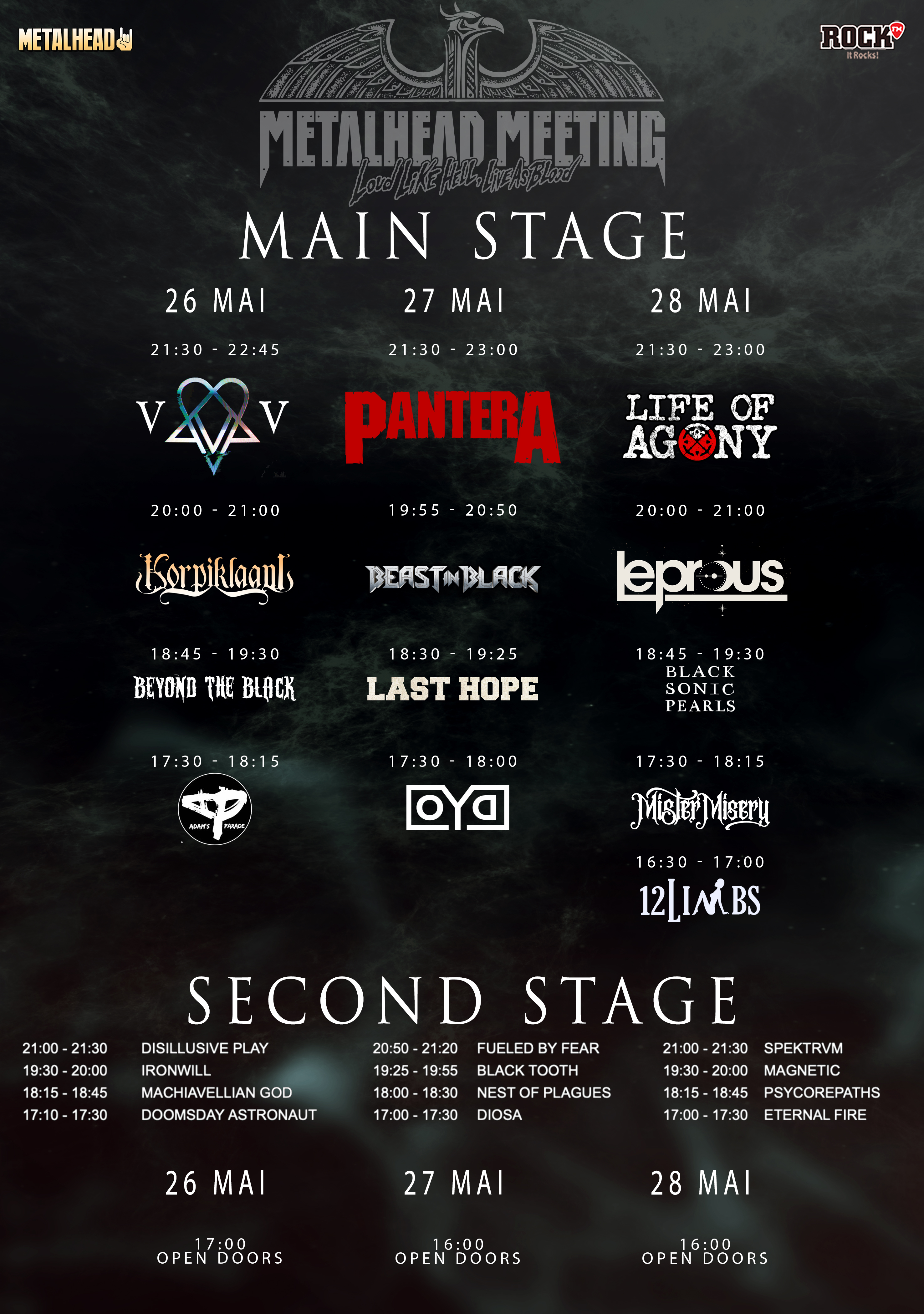 VV, Korpiklaani, Beyond the Black si Adam's Parade vor canta pe 26 mai, Pantera, Beast in Black, Last Hope si OYD pe 27 mai iar Life of Agony, Leprous, Black Sonic Pearls, Mister Misery si 12 Limbs pe 28 mai
